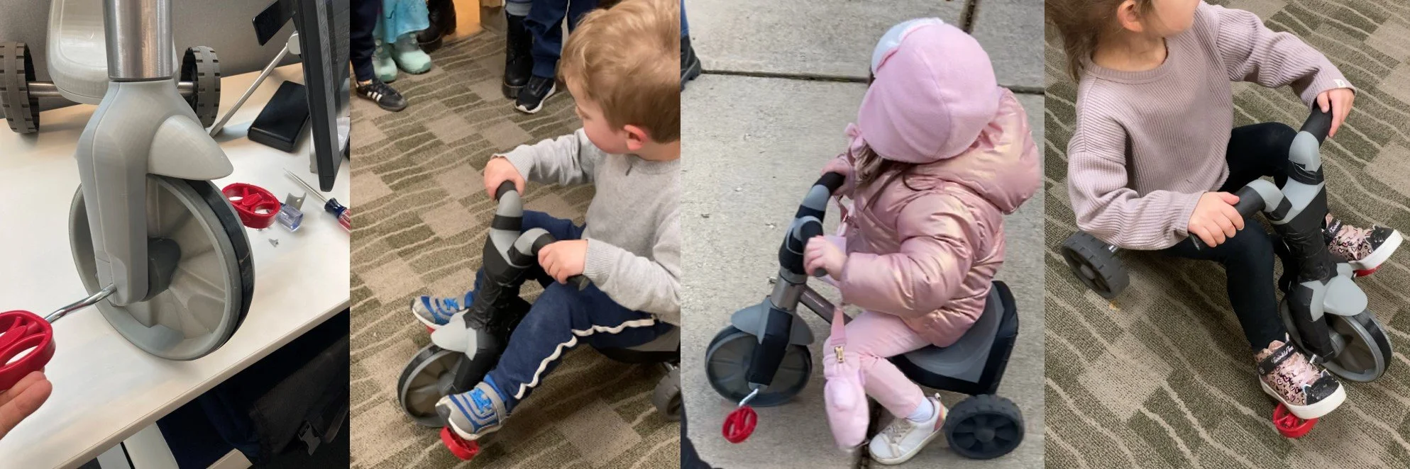 Earlier smaller wheeled prototypes were tested with users of different ages. From these tests we decided on larger wheels and a wider tire as well as some more needed strengtheining