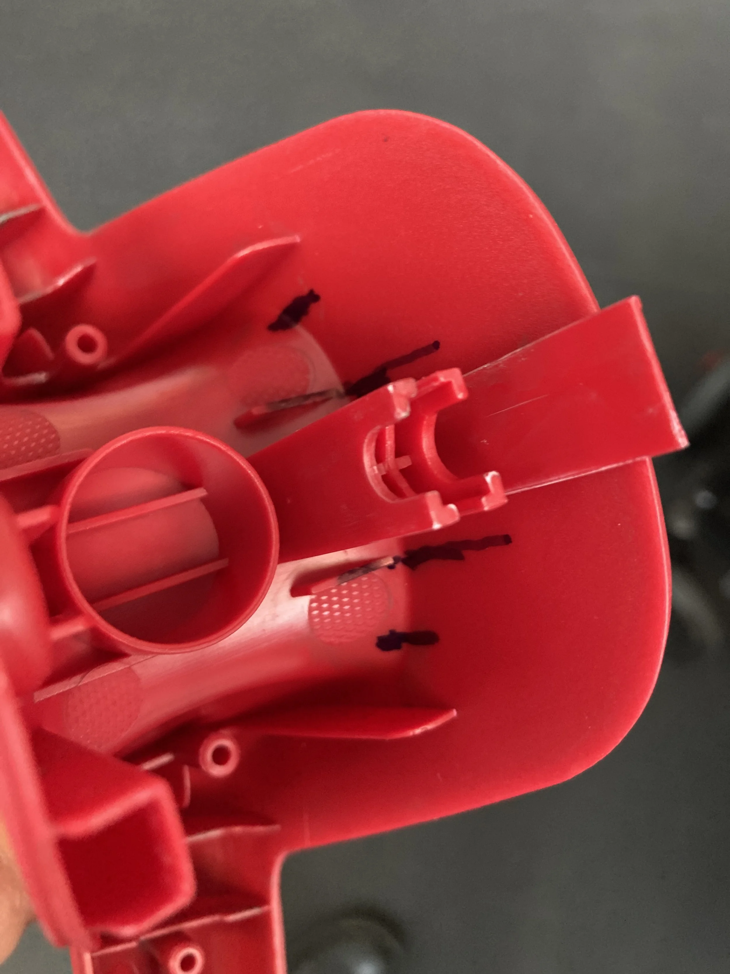 Reviewing all of the details of the pilot production parts. Left to right: reviewing the replacement parts and procedure with Quality Assurance and Customer Service for sending and installing a replacement back wheel, then suggesting location for additional rib structure for better drop test result, and finally illustrating to the manufacturing engineers why we needed drain holes in the seat to prevent sitting water.